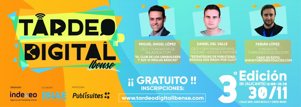 | 16:00 –16:15 Recepción de asistentes. Recibiremos a todos los asistentes en la Asociación de Empresarios de Ibi y Comarca (IBIAE). 16:15 – 16:55 Miguel Ángel López (fundador de enlazalia.com). 'El club de los LinkBuilders y sus 10 reglas básicas'. Miguel, fundador de www.enlazalia.com, nos enseñará el Club de los LinkBuilders y nos explicará detalladamente sus 10 reglas básicas. 17:00 – 17:40 Daniel del Valle (CEO y SEM manager nivel calidad Google Partner). 'Estrategias de publicidad: Google Ads'. Daniel nos relatará las estrategias de publicidad con Google Ads (pago por clic). 17:45 – 18:25 Fabián López (fundador turronesydulces.com). Fabián nos hablará de su caso de éxito con su web www.turronesydulces.com 18:25 – 19:00 Networking Podremos dialogar abiertamente entre todos los asistentes y ponentes dentro de un evento abierto y participativo. |