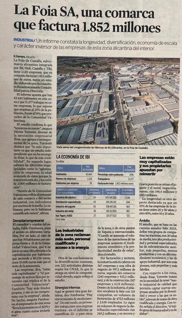 Las empresas industriales de la Foia de Castalla son el motor de este territorio. Los datos y las cifras del informe promovido por la Asociación de Empresarios de la Foia de Castalla, y realizado por la consultora Económicamente, contabilidad para la dirección, ha servido para que el diario Expansión se haga eco de él en sus páginas (dentro de la edición de la Comunitat Valenciana).