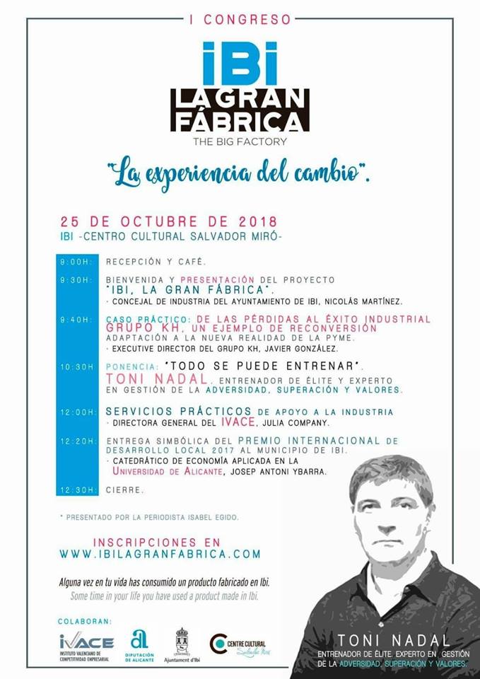 La Asociación de Empresarios de Ibi y Comarca asiste el jueves 25 de octubre al I Congreso Ibi la gran fábrica y que lleva por título ‘La Experiencia del cambio’. El ponente principal será Toni Nadal, exentrenador de Rafael Nadal, y uno de los técnicos más reputados del mundo del deporte.