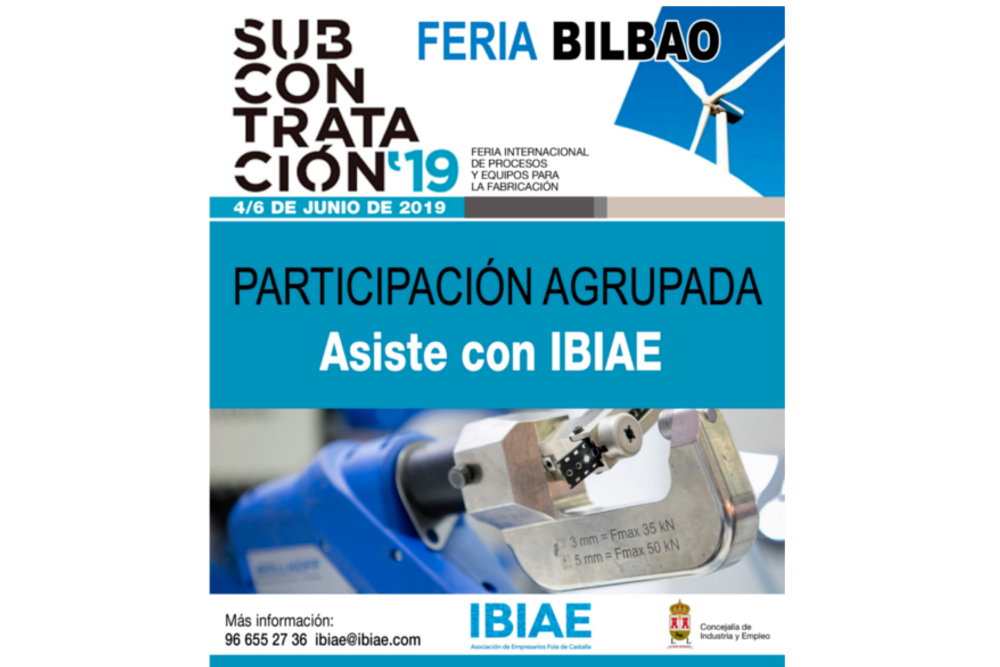 Desde el año 2003, la Asociación de Empresarios de Ibi y Comarca asiste a la Feria de Subcontratación de Bilbao y no faltará a la cita del 2019, que tendrá lugar del 4 al 6 de junio en el recinto Ferial del BEC. Las pymes subcontratistas que busquen captar nuevos clientes, reforzar su cooperación con otras empresas y acceder a mercados exteriores tienen una cita en el certamen. IBIAE, en colaboración con la concejalÃa de Industria del Ayuntamiento de Ibi, organiza la asistencia y participación agrupada de empresas en un espacio conjunto en el Bilbao Exhibition Centre. Las previsiones iniciales, apuntan a una participación cercana a los 21.000 visitantes y más de 1.400 firmas expositoras, aproximadamente.