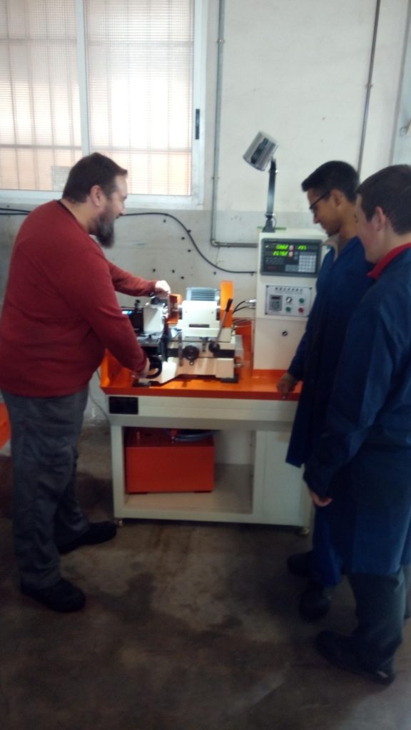 Salvador Payá, responsable de taller, explica el funcionamiento de las nuevas máquinas a los jóvenes estudiantes que disfrutan con las enseñanzas de un experimentado profesional dentro del mundo del mecanizado de precisión.