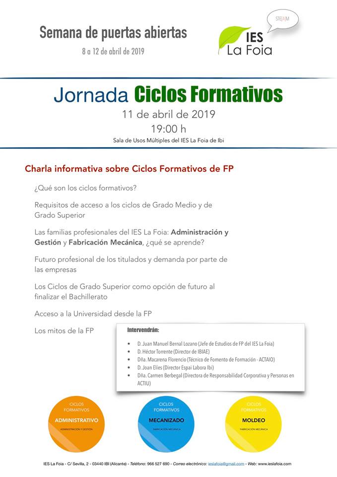 IBIAE participará en la charla informativa y el director de la Asociación de Empresarios de Ibi y Comarca, Héctor Torrente, pondrá en valor la FP para las empresas de la Foia de Castalla. El evento está abierto a alumnos y familias que consideren decantarse por la FP. También estará Carmen Berbegal, directora de Responsabilidad Corporativa y Personas de nuestra asociada ACTIU.
