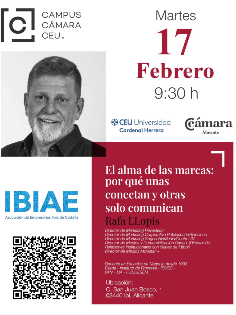 IBIAE organiza una nueva jornada formativa titulada El alma de las marcas: por qué unas conectan y otras solo comunican, que contará con la ponencia de Rafa Llopis, en colaboración con Campus Cámara CEU, CEU Universidad Cardenal Herrera y Cámara Alicante.
