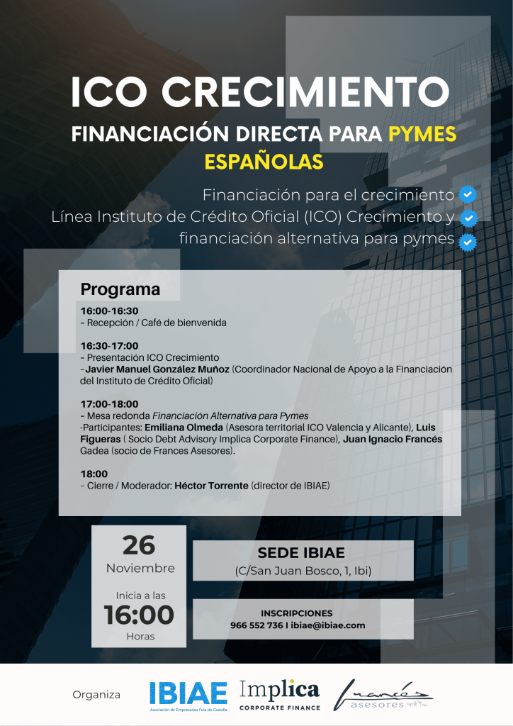 | Santiago Novoa, Director General de Financiación Corporativa, Pymes y Midcaps del Instituto de Crédito Oficial (ICO). Emiliana Olmeda, Asesora territorial ICO Valencia y Alicante. Luis Figueras, Socio Debt Advisory Implica Corporate Finance. Juan Ignacio Francés Gadea, Socio de Francés Asesores. Moderador: Héctor Torrente, Director de IBIAE. |