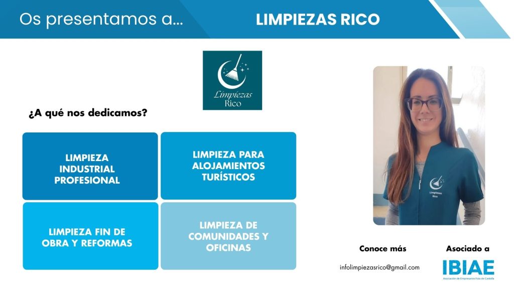 La compañÃa asociada de IBIAE LIMPIEZAS RICO, ofrece servicios de limpieza profesional adaptados a las necesidades de empresas, comunidades y particulares de la comarca.