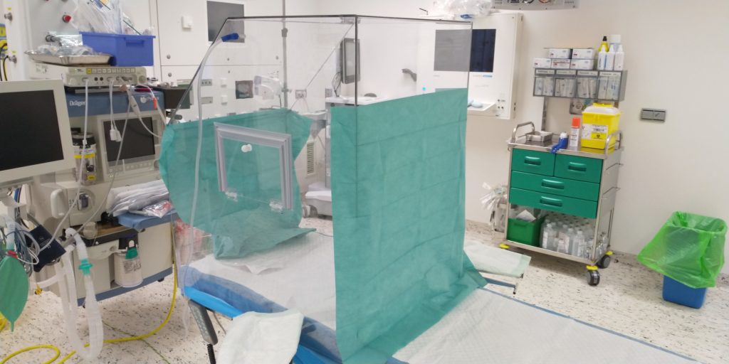 A su vez, se han habilitado dos ventanillas laterales cerradas con juntas estancas y, en caso de que un ayudante tenga que apoyar al anestesista, estas se pueden abrir y permiten la introducción de material y/o manos de los técnicos, sin exposición directa con el paciente.