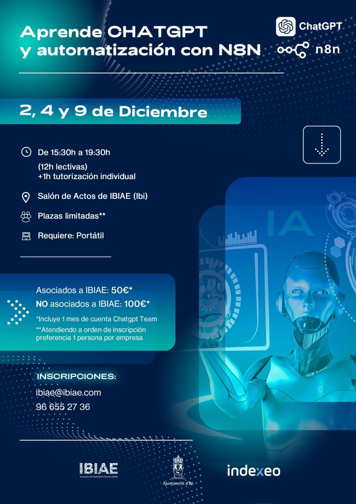 IBIAE organiza junto INDEXEO MARKETING los dÃas 2, 4 y 9 de diciembre una jornada formativa presencial para aprender a utilizar ChatGPT y N8N, la herramienta de automatización que permite optimizar procesos de trabajo sin necesidad de programar.