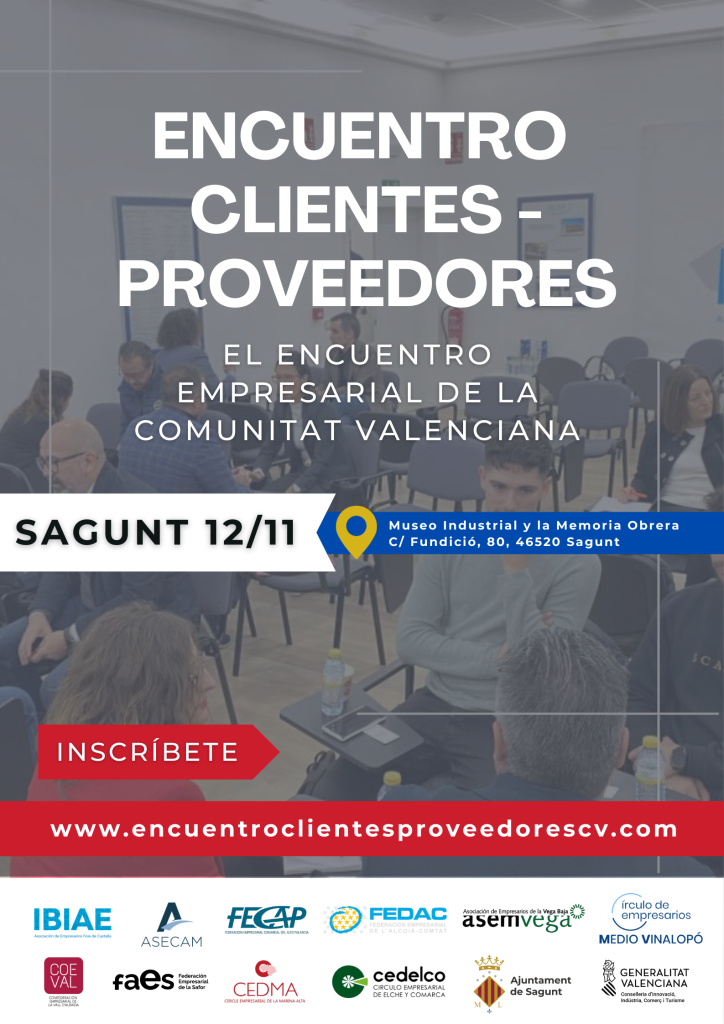 El próximo 12 de noviembre, Sagunt acogerá una nueva edición del Encuentro Clientes–Proveedores de la Comunitat Valenciana, la cita imprescindible para ampliar tu red de contactos y descubrir nuevas oportunidades de negocio sin salir del territorio. A través de reuniones previamente concertadas, las empresas participantes podrán conectar cara a cara con potenciales clientes, proveedores y colaboradores, impulsando alianzas estratégicas y fortaleciendo el tejido empresarial valenciano. ¿Por qué buscar fuera lo que tenemos cerca? Este encuentro demuestra que, muchas veces, los socios ideales están a la vuelta de la esquina.