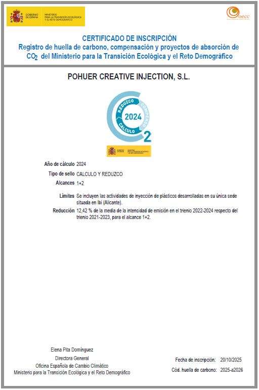 POHUER CREATIVE INJECTION, S.L., compañía asociada a IBIAE, ha obtenido el Sello Oficial de Huella de Carbono, Compensación y Proyectos de Absorción de CO₂, otorgado por el Ministerio para la Transición Ecológica y el Reto Demográfico (MITECO). Este reconocimiento acredita que la empresa ha calculado, verificado e inscrito oficialmente sus emisiones de gases de efecto invernadero (GEI) en el Registro de Huella de Carbono correspondiente al ejercicio 2024.