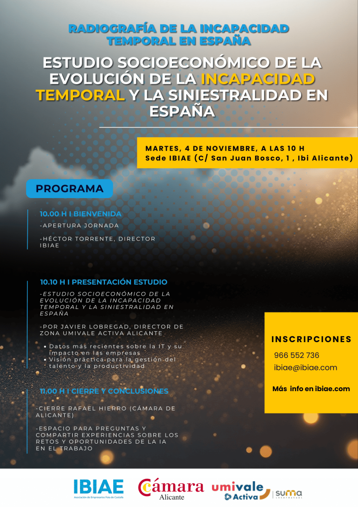 La jornada tendrá lugar el martes 4 de noviembre a las 10:00h en la sede de IBIAE (C/ San Juan Bosco, 1 – Ibi, Alicante) y abordará el impacto que tiene la incapacidad temporal en las empresas desde una perspectiva económica, organizativa y de gestión del talento.